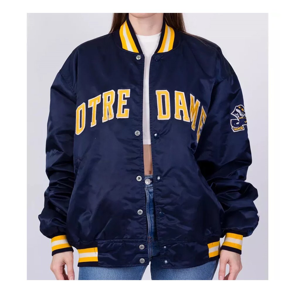 Crafted from high-quality satin, the jacket delivers a smooth, lightweight feel that is both comfortable and durable. The rib-knit cuffs, collar, and hem provide a snug fit that locks in warmth while maintaining flexibility for all-day wear. A full-front snap closure allows for easy layering over shirts or hoodies, making it practical for variable weather. Authentic embroidered team logos and vintage-inspired detailing across the chest and back add an extra touch of collegiate authenticity, making this jacket not only a functional outer layer but also a collector-worthy piece of Notre Dame memorabilia.