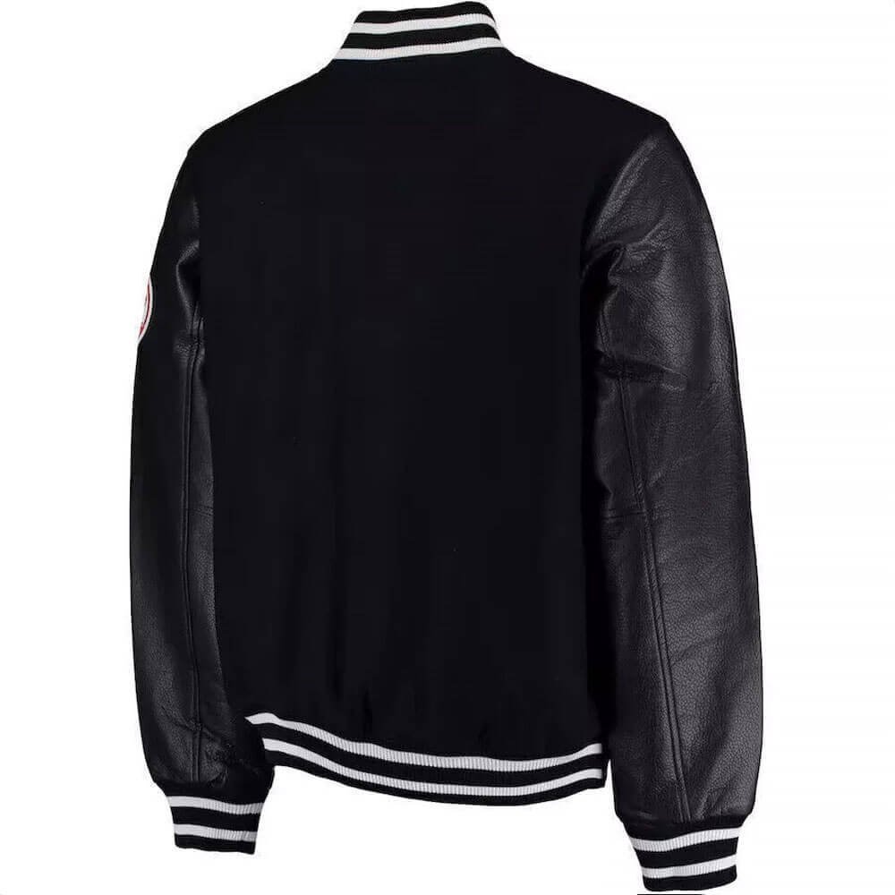 The jacket features a sleek satin or wool body (depending on the version) paired with contrasting sleeves for an authentic varsity look. A full-front snap closure allows easy layering over T-shirts, hoodies, or sweatshirts, making it practical for cooler weather. Rib-knit collar, cuffs, and waistband provide a snug, comfortable fit while preserving the classic bomber silhouette. The relaxed fit ensures freedom of movement and allows layering without feeling bulky, making it both functional and stylish.