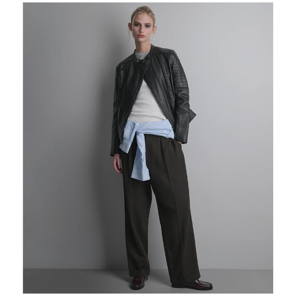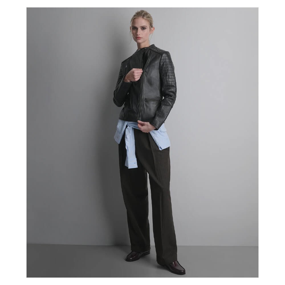 The jacket’s asymmetrical front zipper closure allows for effortless wearing and adds a modern biker edge. Wide lapel collars emphasize its classic biker aesthetic, while zippered cuffs give you the flexibility to adjust the fit to your comfort. Functional side pockets provide a convenient place to store essentials while maintaining a clean, streamlined look.