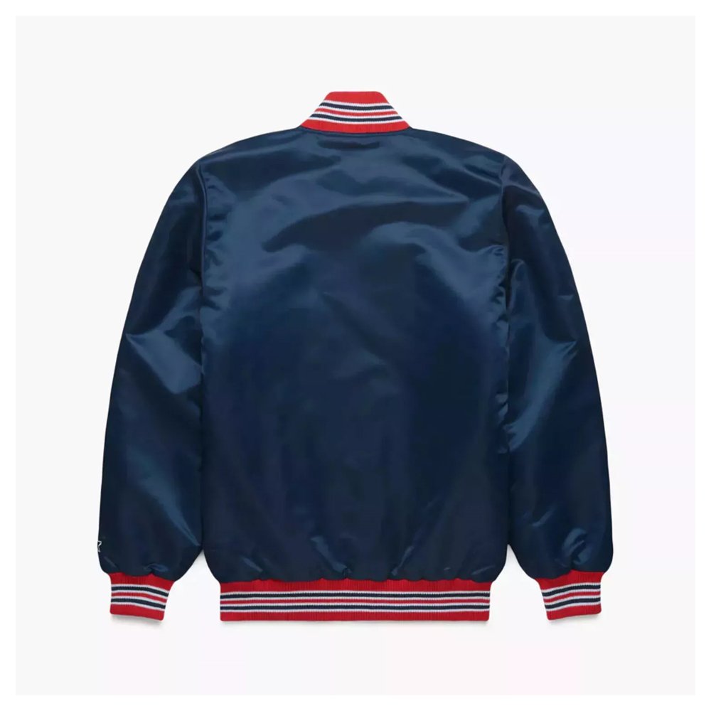 Crafted from premium navy satin, the jacket features a smooth, glossy finish that catches the light and adds a polished touch to any outfit. The full-snap front closure offers easy layering over hoodies, tees, or sweaters, making it versatile for game days, casual outings, or streetwear looks. Rib-knit collar, cuffs, and waistband provide a snug, comfortable fit while maintaining the classic athletic silhouette.