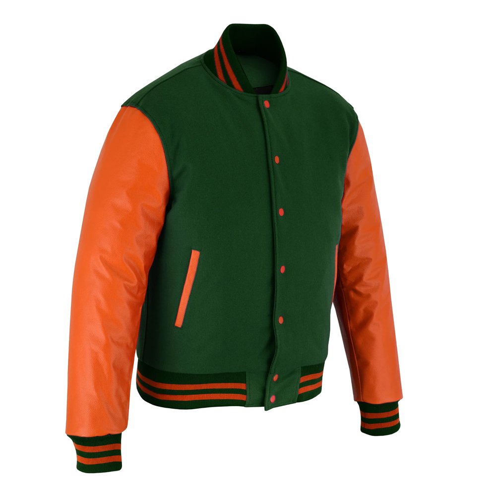 Green and Orange Varsity Letterman Jacket, a vibrant twist on classic varsity style. The premium green wool body paired with striking orange sleeves creates a bold, eye-catching look that combines tradition with modern fashion.