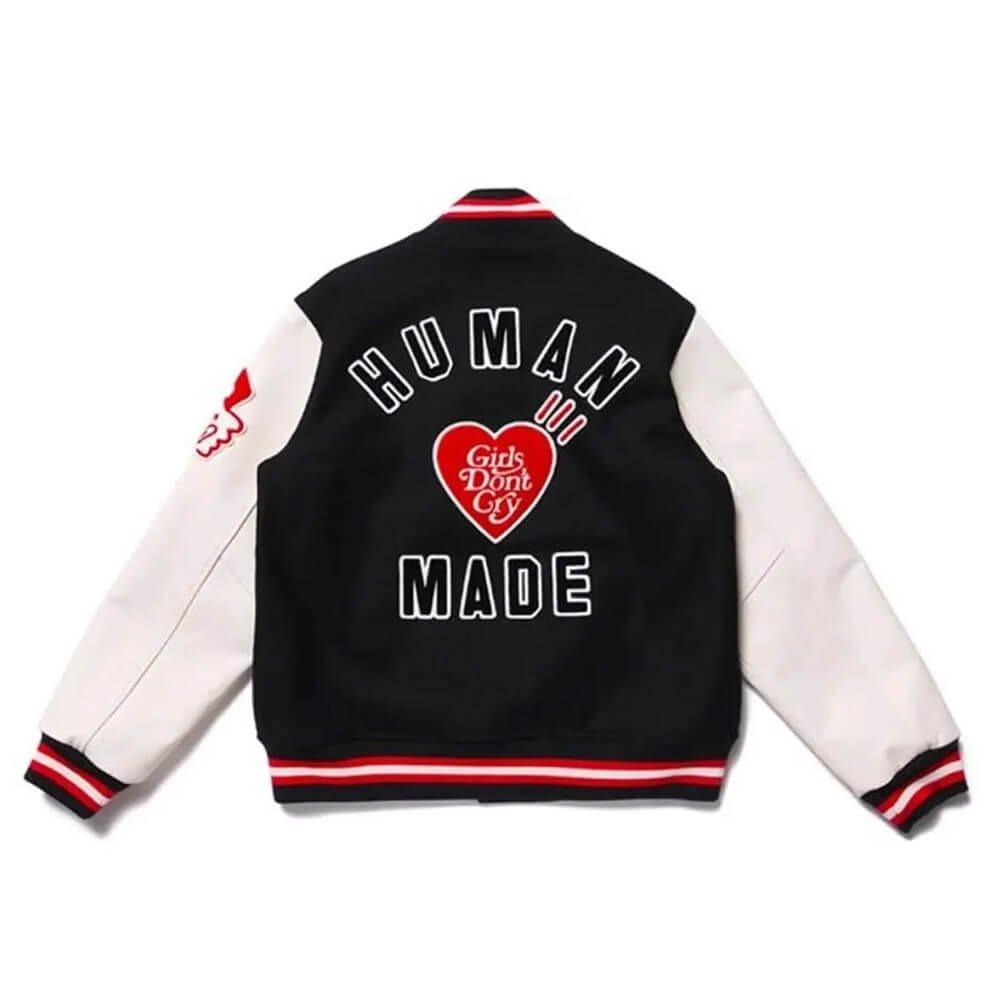 The Human Made x Girls Don’t Cry Varsity Jacket is a standout piece that combines premium craftsmanship with streetwear style. Designed in a classic varsity silhouette, it features a wool body with contrasting leather sleeves, providing warmth and a bold visual appeal. The combination of materials ensures both durability and a refined finish.