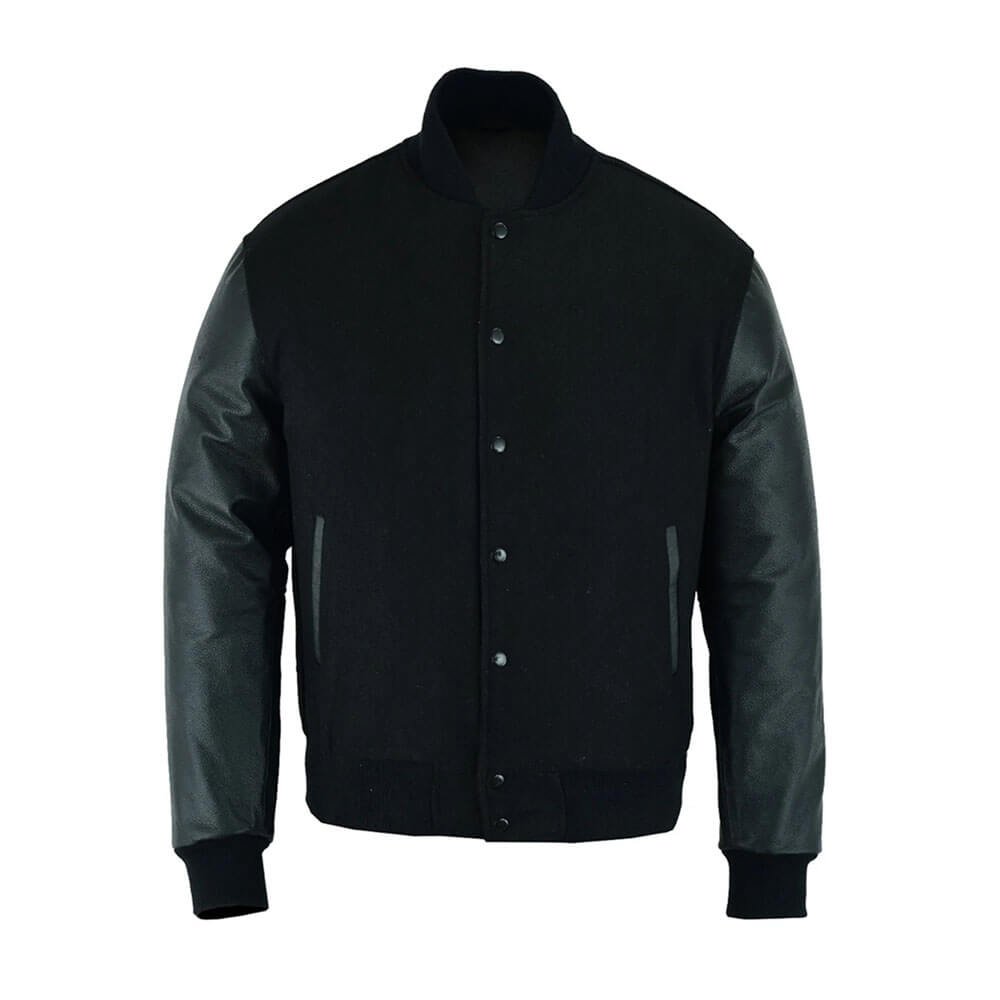 Men Black Wool & Black Leather Varsity Jacket
