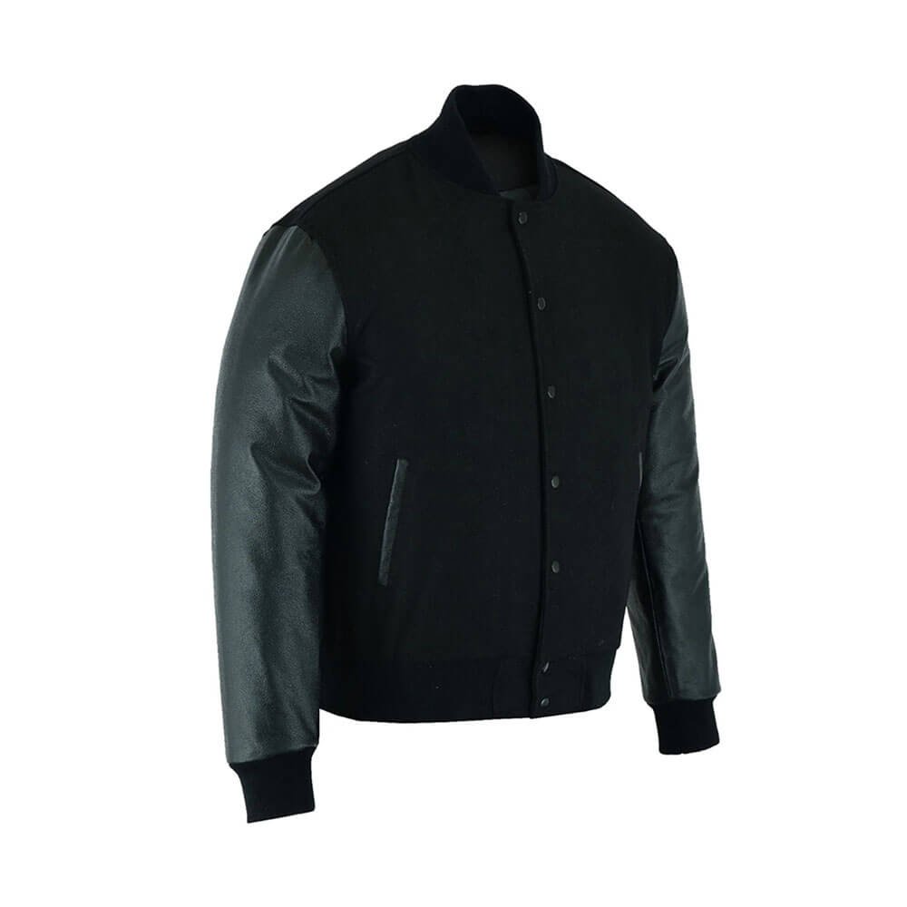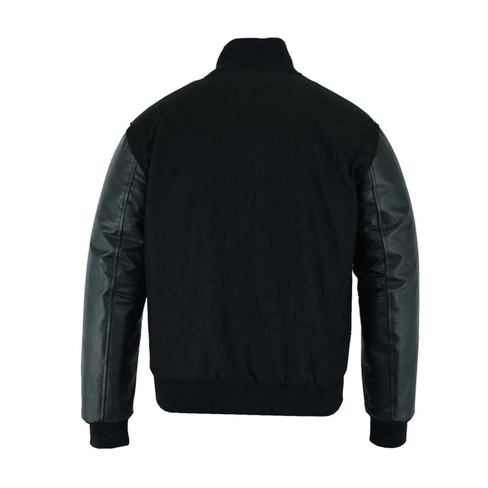 The body of the jacket features high-quality black wool that provides warmth and durability, making it ideal for cooler days. The sleeves are crafted from sleek black leather, adding a sharp contrast and a luxurious touch to the overall design. This combination creates a stylish, sporty appearance that works effortlessly with jeans, joggers, or casual trousers.