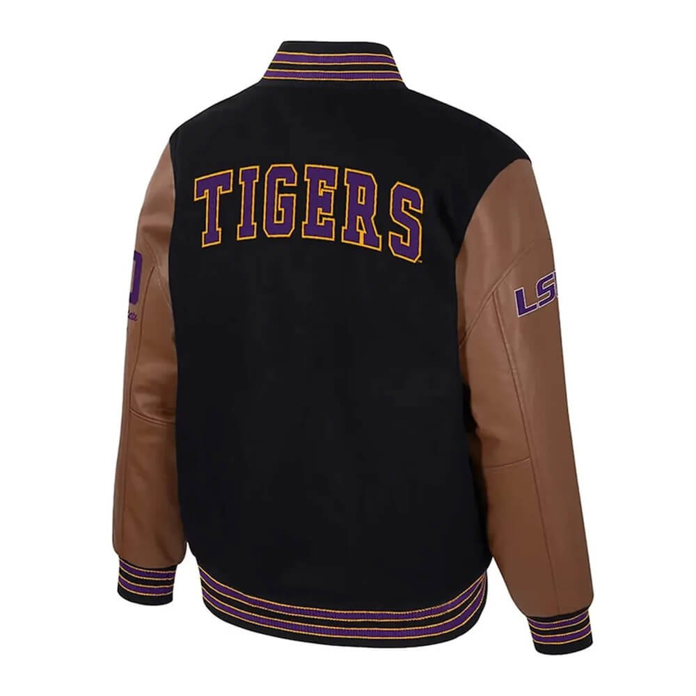 Embroidered LSU Tigers logos on the chest and back showcase your team loyalty in style. The classic letterman silhouette maintains timeless appeal, while the bold black colorway adds a versatile, modern touch. Pair it with jeans, joggers, or sneakers to complete a sharp, casual look that works for any setting.