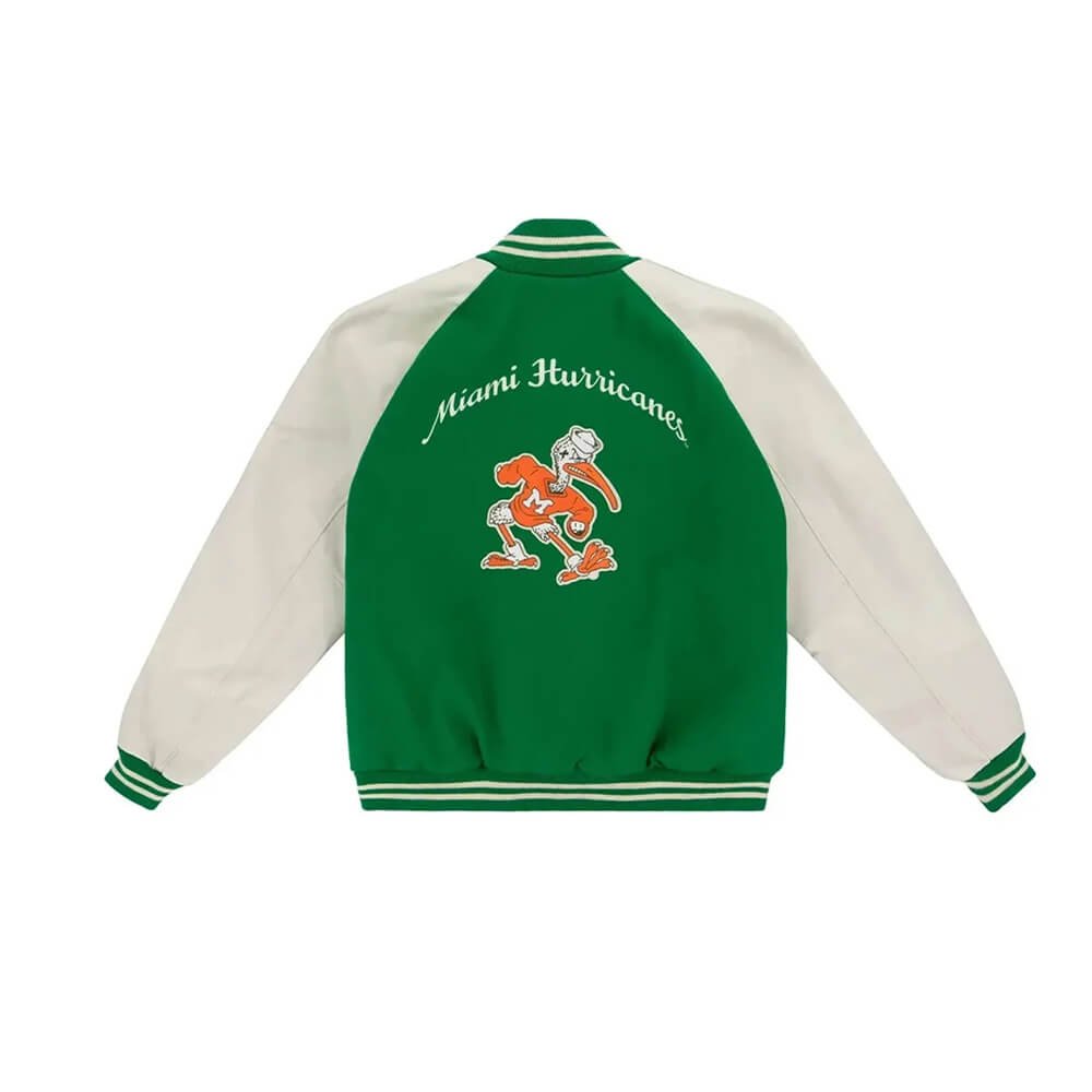Show your Hurricanes pride with the Men’s Miami Hurricanes 1969 Varsity Jacket. Designed in classic letterman style, it features a wool body and genuine leather sleeves, capturing the vintage collegiate look from 1969. The green and white color-blocking combined with embroidered team logos makes this jacket a standout piece for fans and collectors alike.