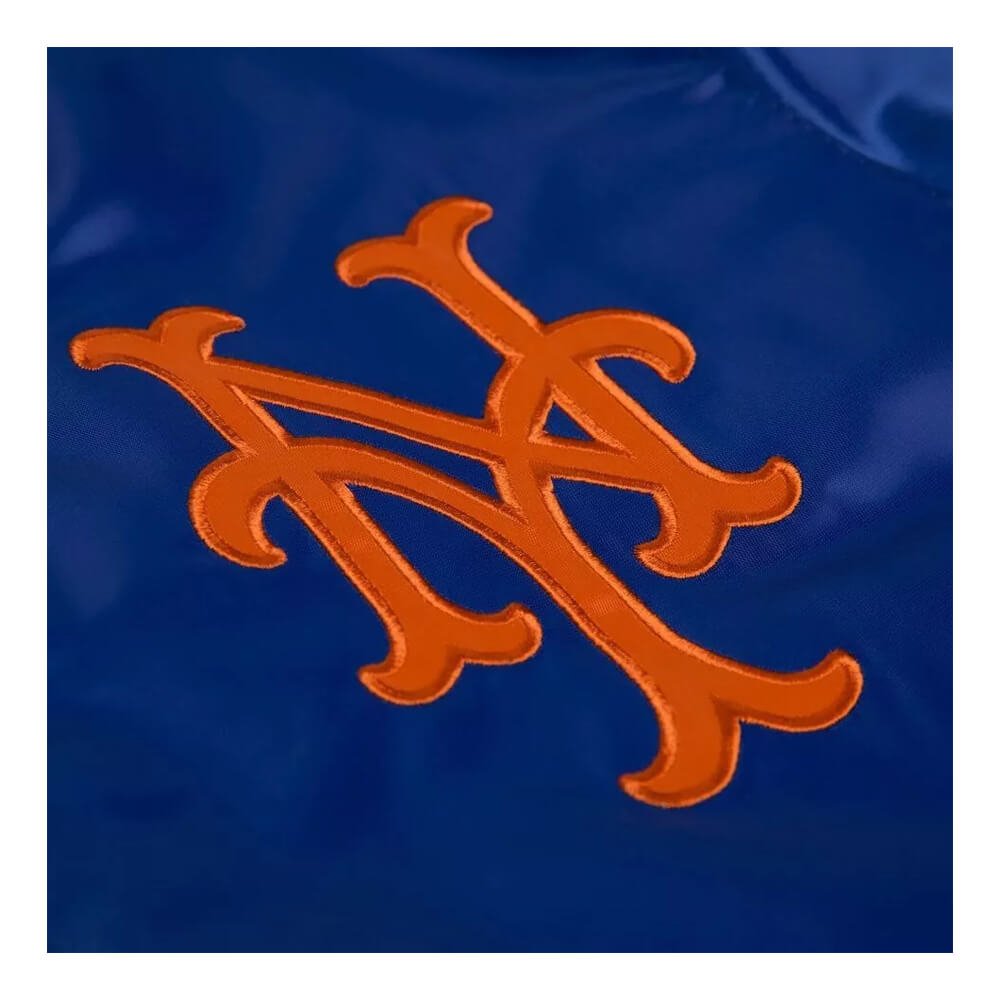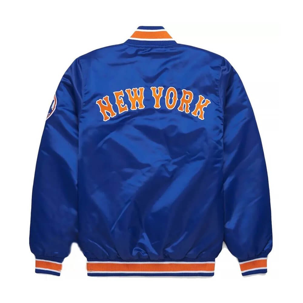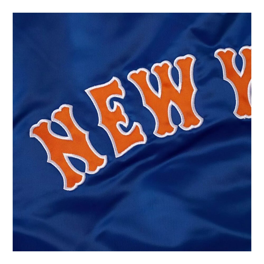 An embroidered New York Mets logo on the chest proudly showcases team pride and adds authentic MLB appeal. Every stitch reflects careful craftsmanship, giving the jacket a premium look and feel. Its bold color combinations and satin sheen create a nostalgic vibe reminiscent of 90s baseball fashion, making it a must-have for collectors and fans alike.