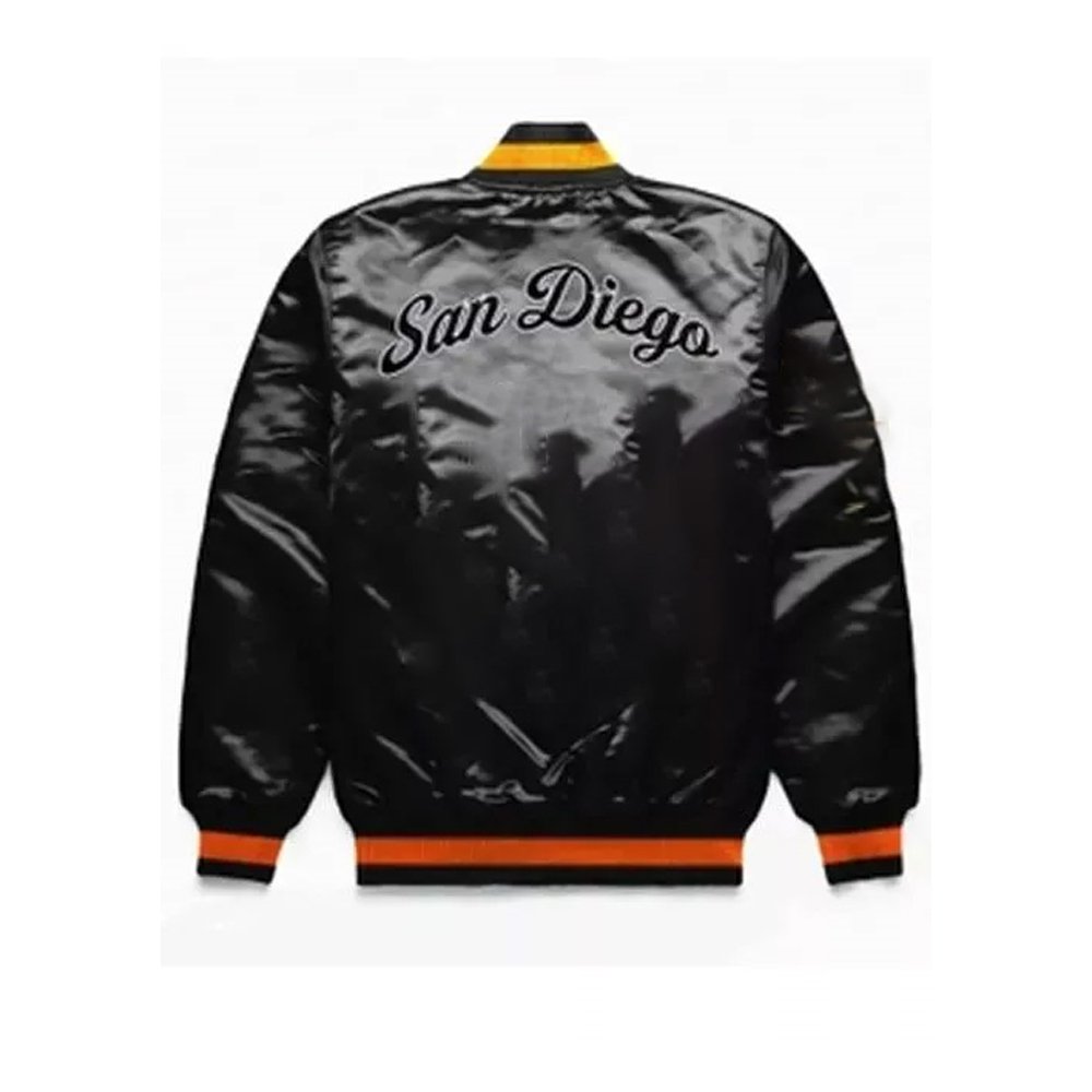 An embroidered San Diego Padres logo on the chest proudly showcases team pride and authentic MLB branding. The soft interior lining provides warmth, making it suitable for cooler spring or fall days while still remaining breathable. Its classic satin construction ensures durability, helping the jacket maintain its shape and quality over time.
