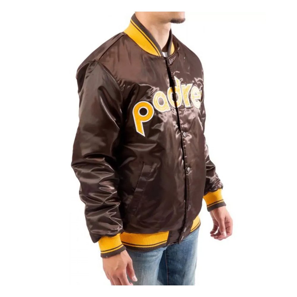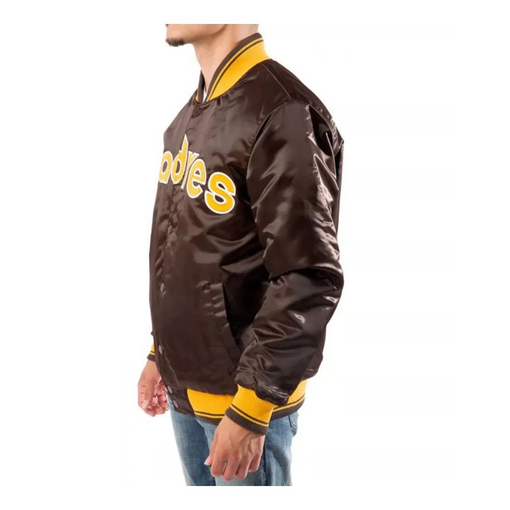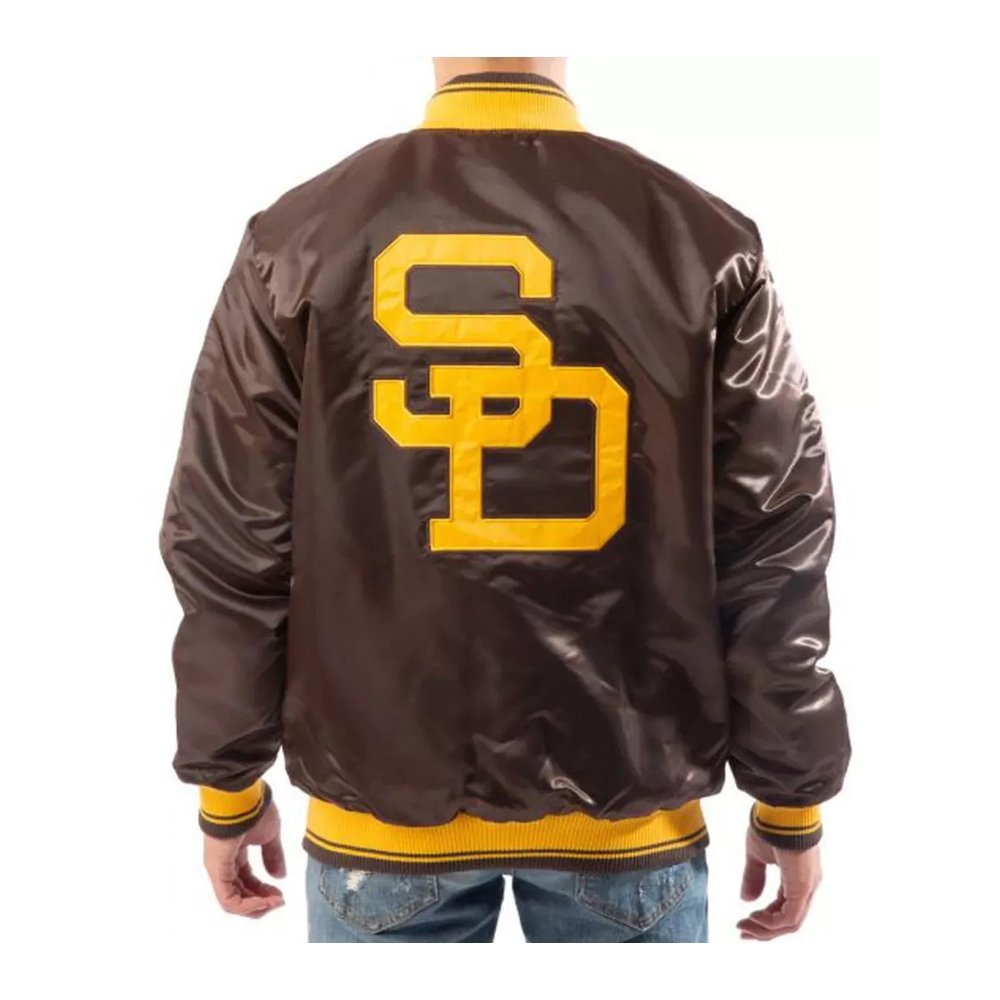 Celebrate the heritage of the San Diego Padres with this premium bomber jacket. Its classic design, embroidered detailing, and comfortable fit make it a must-have for collectors, dedicated fans, and anyone who loves vintage MLB fashion. Whether worn to the ballpark, a fan event, or as part of a streetwear outfit, the Padres Brown Bomber Jacket combines style, durability, and team spirit in one timeless piece.
