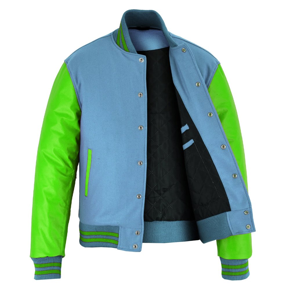 The Sky Blue Wool & Green Leather Varsity Jacket is a stylish blend of classic varsity design and modern fashion. Its sky blue wool body offers warmth and durability, while the genuine green leather sleeves and trims provide a bold and eye-catching contrast.