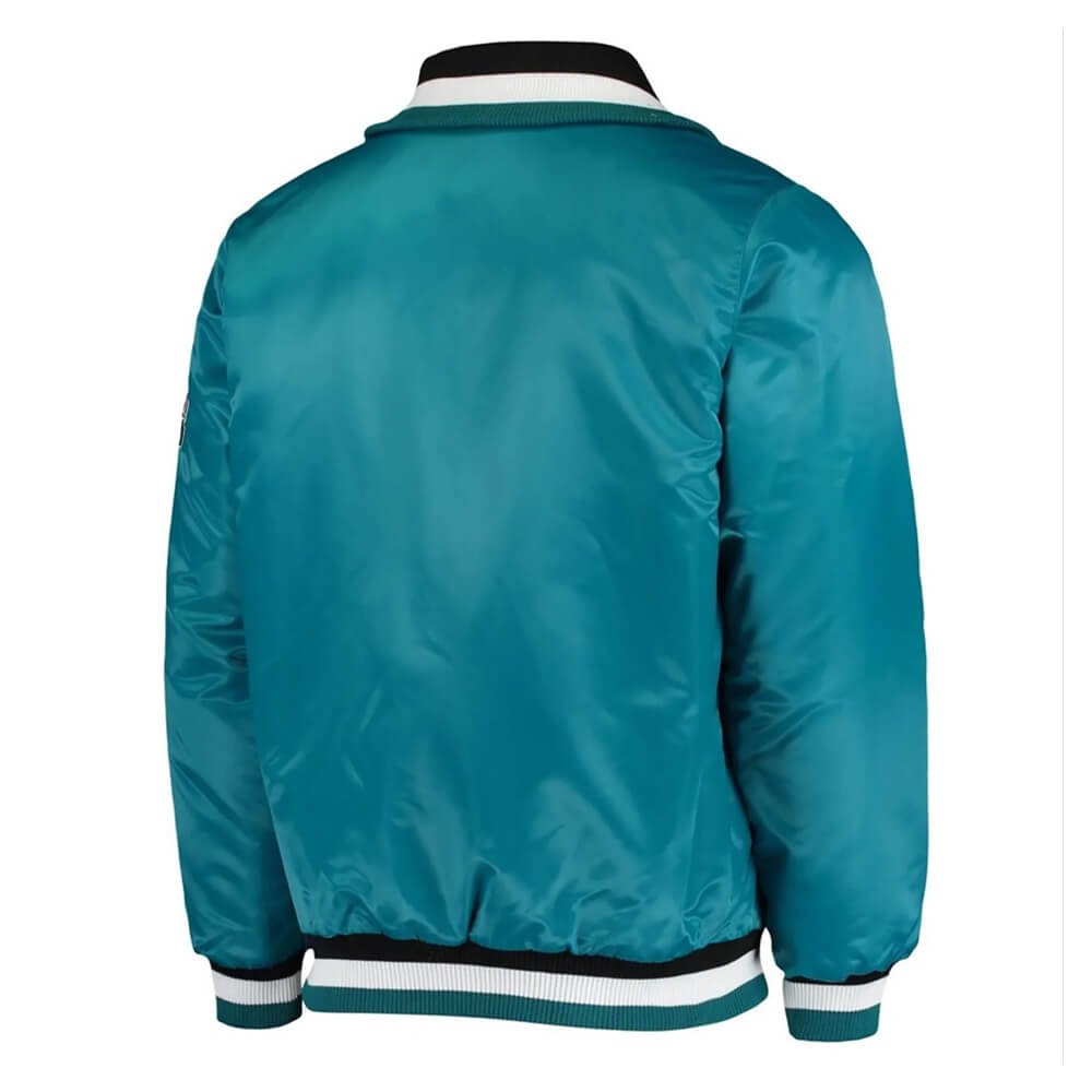 Crafted from smooth satin, the jacket features a vibrant teal blue body that highlights your Sharks spirit. Contrasting details, including ribbed cuffs, collar, and hem, add a polished, retro varsity look. The front snap-button closure makes it easy to layer over hoodies, tees, or sweatshirts, while the soft inner lining ensures all-day comfort.