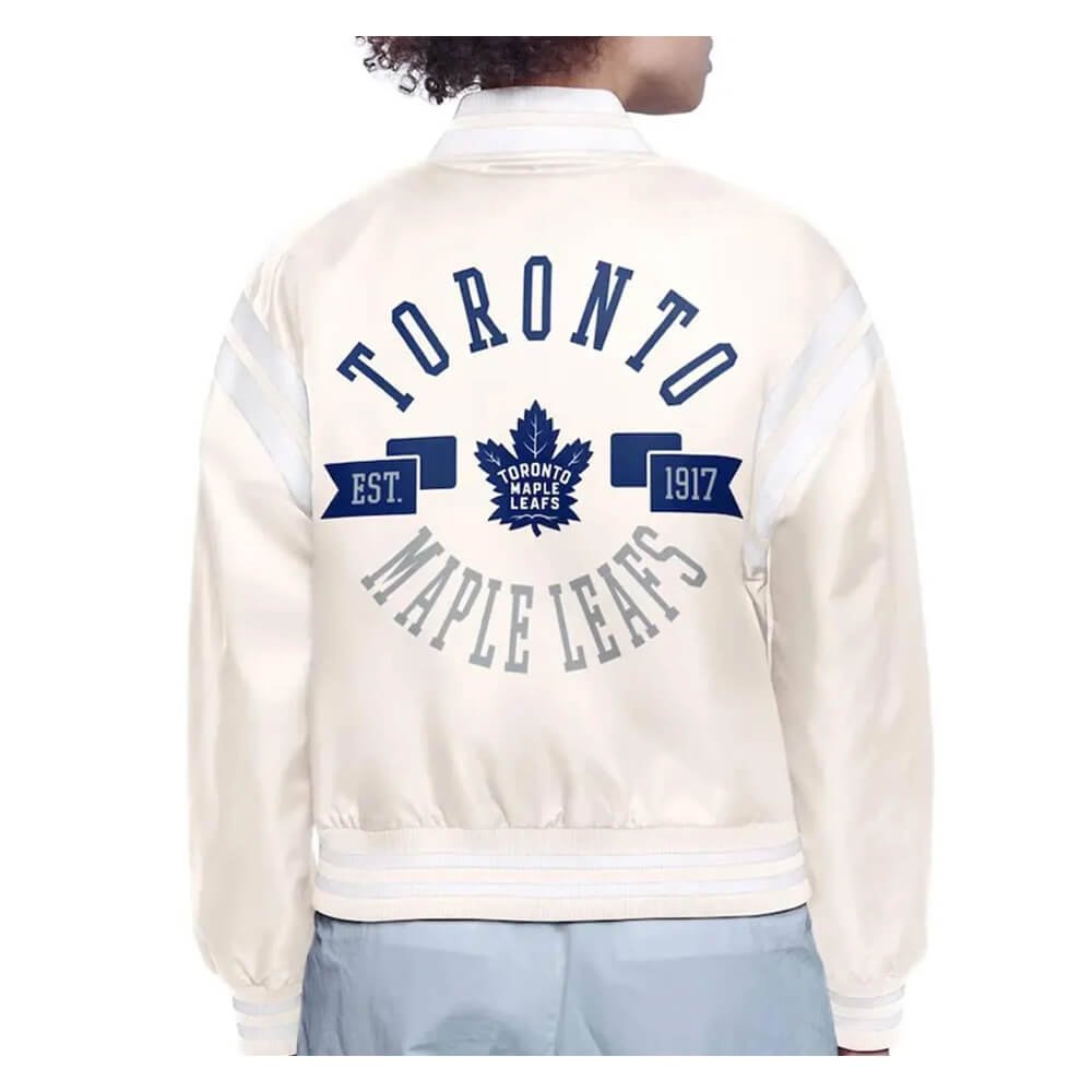 Show your hockey pride in timeless style with the Toronto Maple Loafs Cream Satin Varsity Jacket. Crafted from smooth cream-colored satin, this jacket delivers a sleek, polished look that stands out both on and off the ice. The iconic team logo embroidered on the chest proudly displays your loyalty to one of hockey’s most legendary franchises.