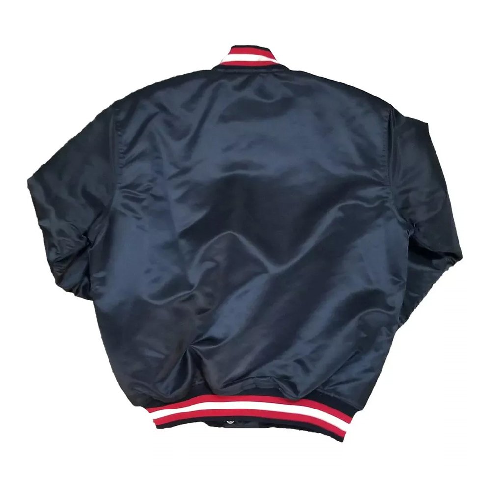 Made from high-quality satin, the jacket offers a smooth, lightweight feel while maintaining durability and comfort. Rib-knit cuffs, collar, and hem provide a secure fit, and the full-front snap closure adds authentic varsity functionality. Its relaxed bomber silhouette gives it a vintage edge, perfect for layering over casual or game-day outfits.